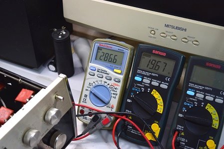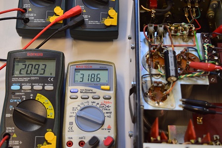 左テスターはヒーター電圧です。20.93Vで少し高めです。右の白テスターは高圧B1です。318.6Vとかなり高い値です。