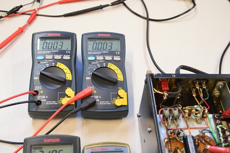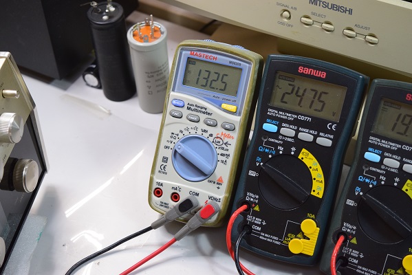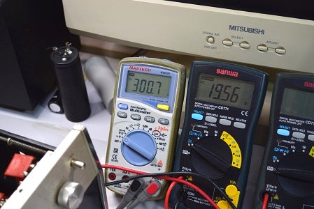 左の白いテスターは高圧B1です。 300.7Vで規定通りです。右テスターはヒーター電圧です。こちらも19.56Vでほぼ規定通りです。