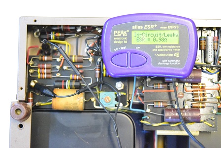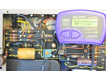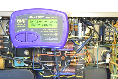初段管カソードバイパスコンです。リークとESRも表示の最大値40Ωを越して全く機能していません。
