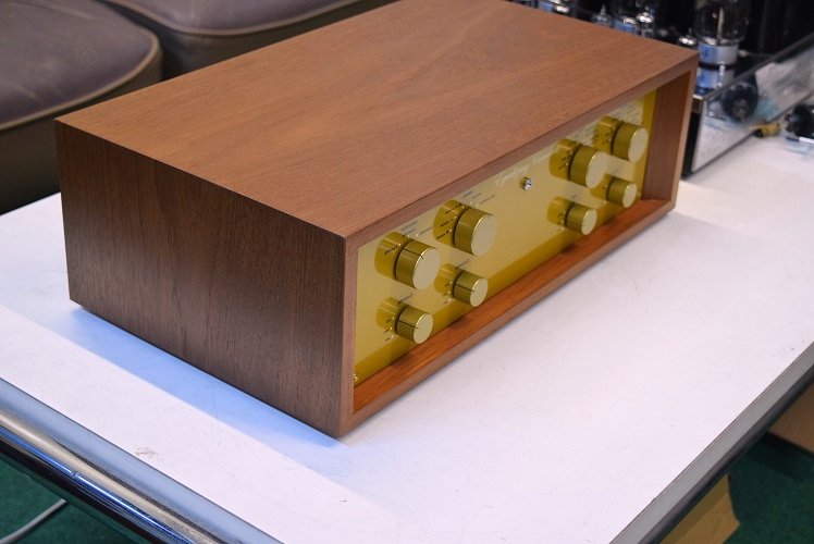 製品の真空管はMullardの新品で、カップリングコンデンサーは最近当工房でMarantz7等のレストアに使う黒いUSA仕様で組んでいます。これは最近のコンデンサーとしてはかなりバンブルビーに近い透明感が感じられ、マニアの間でも好評を頂いています。