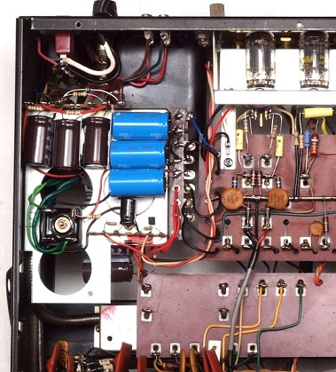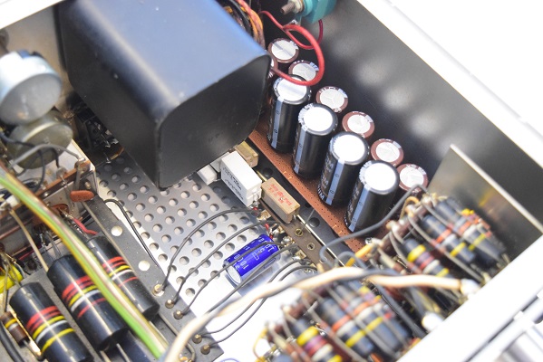電源回路を大改造されたMC60です。以前他でのレストアでチョークコイルを移動させ、本来付いている元のブロックコンデンサーの配線を全て撤去し、新規にフレームを作って国産汎用のブロックコンデンサーを追加されました。