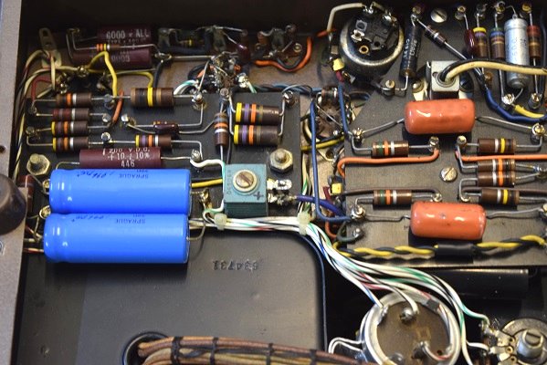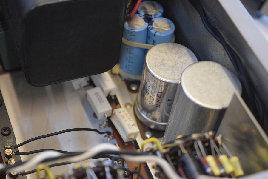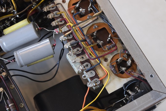 この個体の電源回路では電解ブロックコンデンサーが不良のため、前のレストアされた方は黄色のSPRAGUEと青のチューブラコンを取り付けられています。