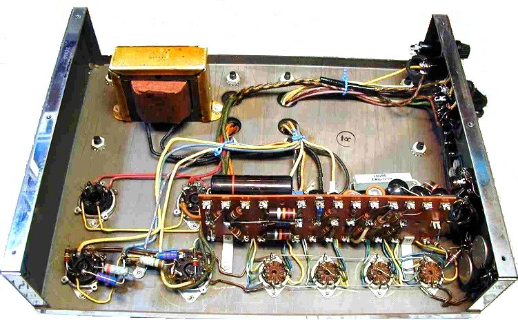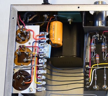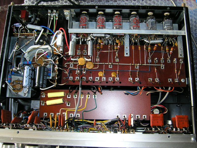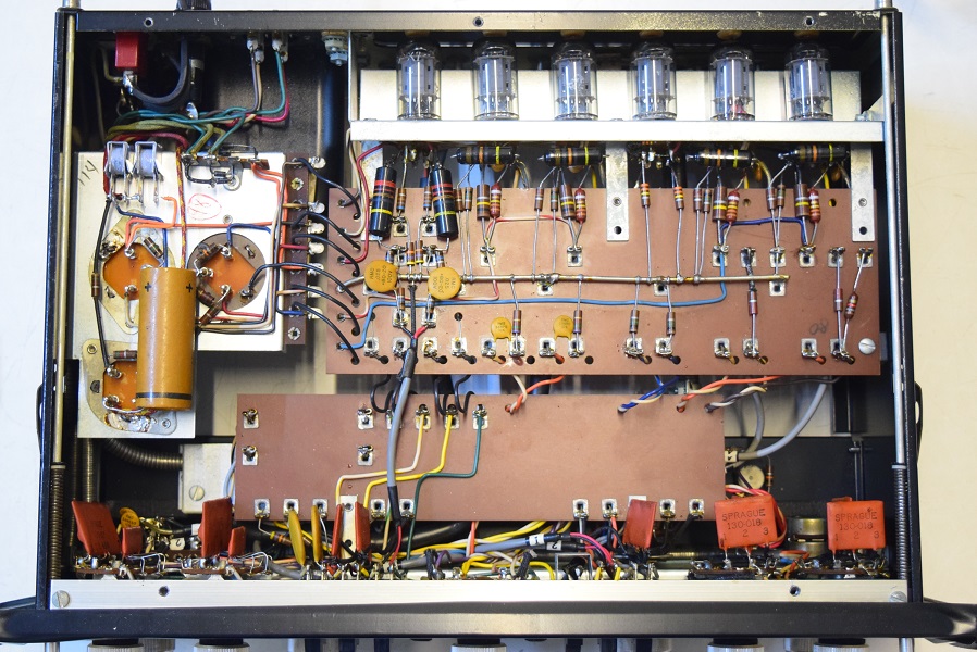 これはこちらのmodel 2 の内部です。以前他でレストアされた状態です。青い2本のコンデンサーはバイアス用の代品コンデンサーです。