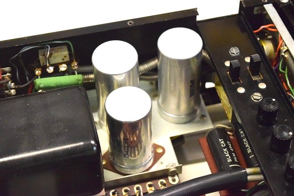 出力トランスの隣に追加の電解ブロックコンデンサーが見えます。