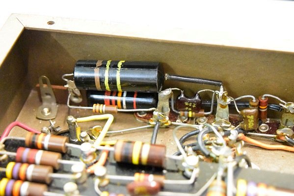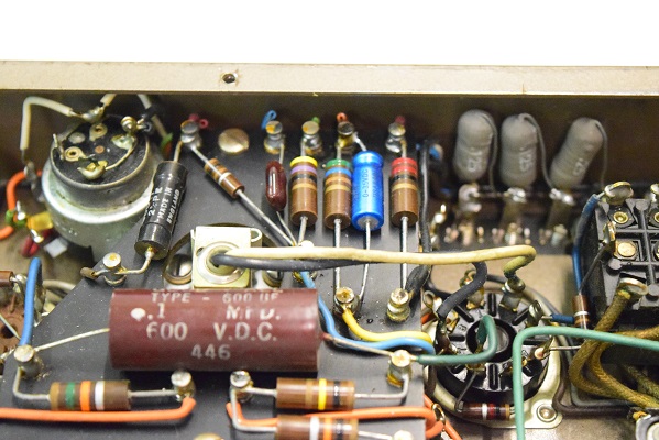 初段管のカソードバイパスコンも純正SPRAGUEの新品に交換しました。(青色)