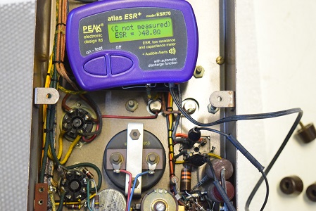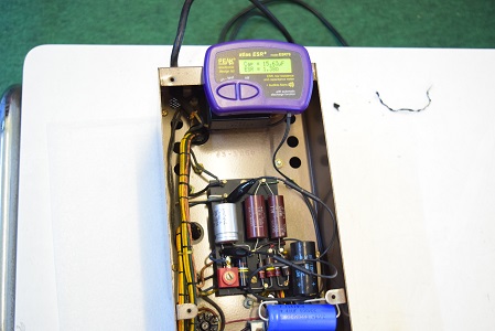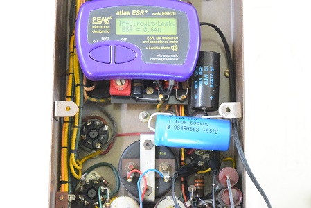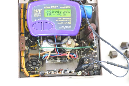 こちらは真空管初段のカソードバイパスコンです。Leaky表示でリークしESRも最大値を示し機能していません。