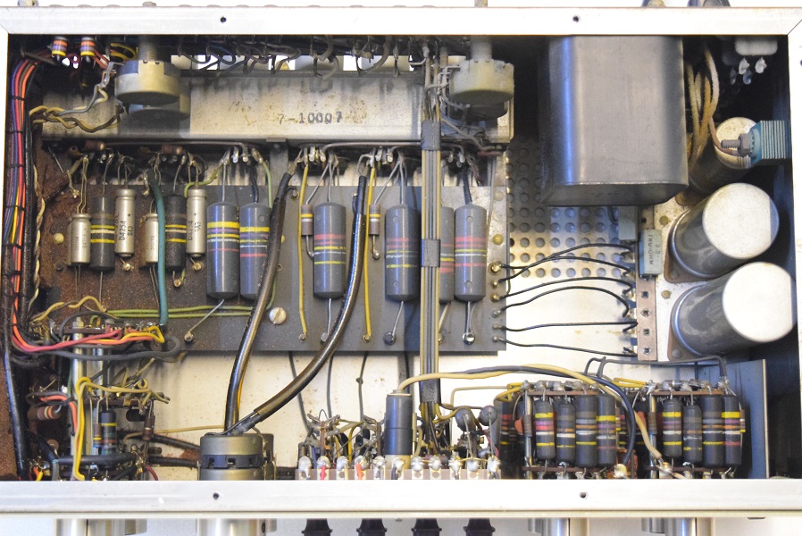 バンブルビーに亀裂が入っています。俵形2段積の段付きリード線が付いたカソードバイパスコンは2桁台以前の特徴です。この上に緑色シールド線が飛んでいます。本稿最下段でこの緑線について言及しています。