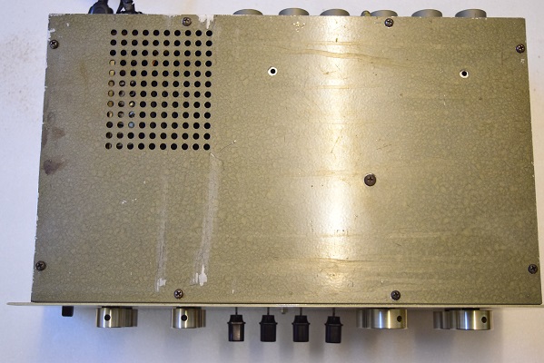 天板と側面は塗り替えられています。本来はグリーンハンマートーン塗装で、当工房の2桁台と同じ色です。中のスポンジがボロボロの状況からするとかなり前に塗り替えられたのでしょう。当時のことを良く知る方の話では船便の輸送中扱いが乱暴でかなり傷が付いて日本でメーカー(日本マランツ)が塗り替えたものがたくさんあったそうです。この為、最初期型には様々な色があるようです。
