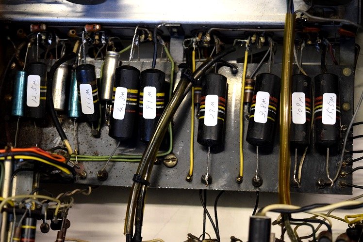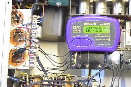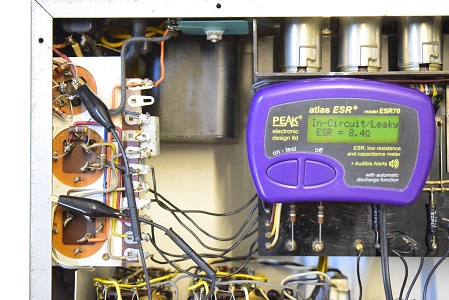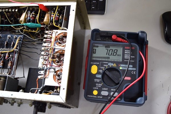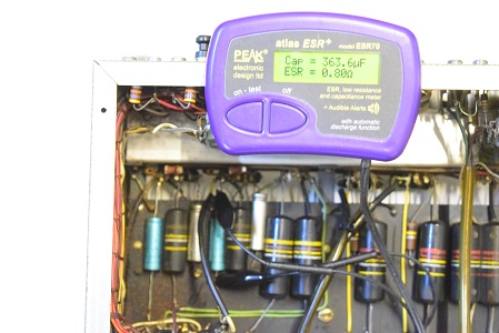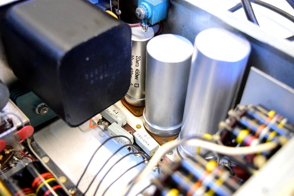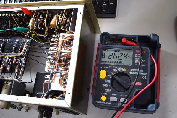 この為、上の画像の様にラインアンプの裏のぶっとい0.33uF/200Vを外して単体検査を行いました。やはり静電容量が膨れ絶縁不良です。