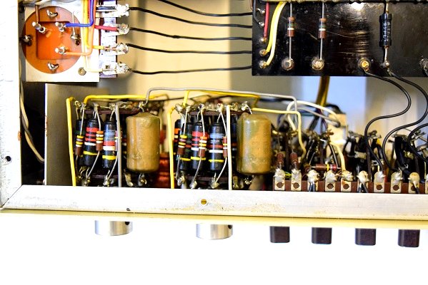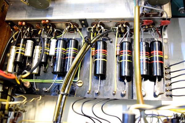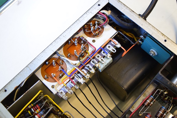内部上面です。電源回路は電解ブロックコンデンサーを3本とも正規仕様の新品に交換しました。カップリングも良品バンブルビーに交換しました。セラミックコンデンサーも純正SPRAGUEのNOS品に交換しました。