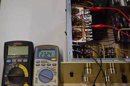 左テスターはヒーター電圧です。15.37VでTelefunken ECC83の動作限界に近いくらい電圧が落ちています。右の白テスターは高圧B1です。215.9Vと極めて低い状態です。
