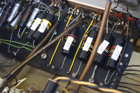 最初の音出しでは低域のトーンコントロールつまみの切替でドーンと言うスクラッチノイズが出なかったので0.22uF/400Vは大丈夫かなと思ったのですが、残念ながら全くの不良でした。(この画像では5.5と2.6の数字の書いてある右から3,4本目のものです)