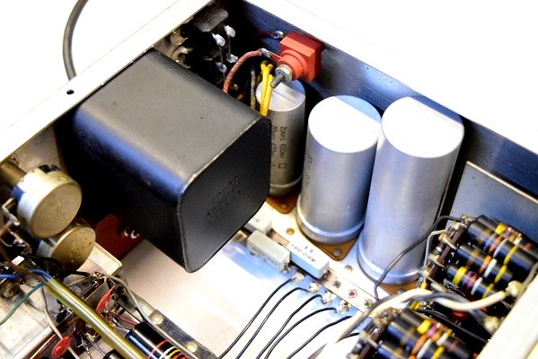裏面です。こちらも殆どオリジナル状態です。本機は、音のレギュレーションを良くするために電源回路やその他の抵抗を純正A&Bの容量の大きいものに交換しています。これにより音に張りを与え明瞭さを増してくれます。特に低音にメリハリが効いて伸び伸びとした重低音はとても良い感じで聴けます。マッキンのように決してボンつかず、トランジスターアンプのように硬過ぎず、軽快な鳴りを響かせます。