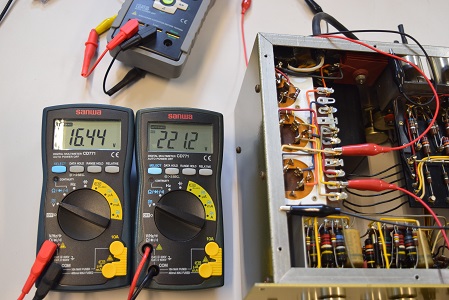 左テスターはヒーター電圧です。 16.58Vでかなり下がっています。右テスターは高圧B1です。238.8Vでこちらもかなり下がっています。