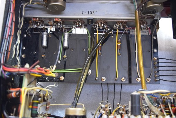内部です。良い状態にレストアされています。電源は高圧セレンを交換されて電解ブロックコンデンサーはオリジナルのままです。当然どこのショップもオリジナルのバンブルビーの良品は持たないので殆どのカップリングコンデンサーはブラックビューティー(160P)でレストアされました。