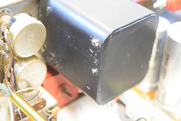 この電源トランスの表面に内部からの錆が白く浮いて来ています。