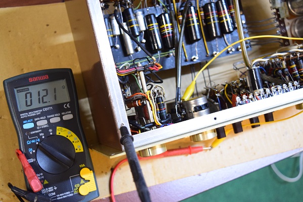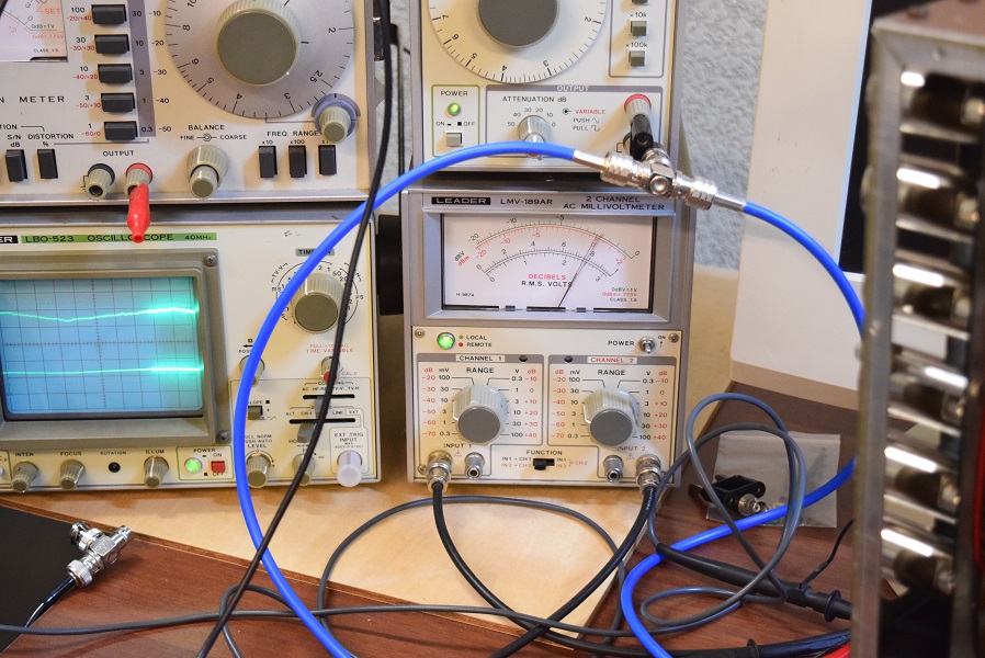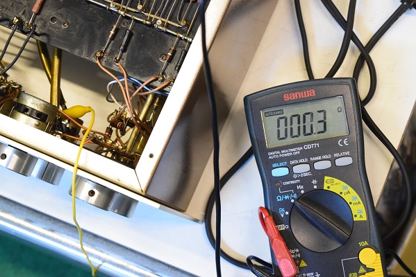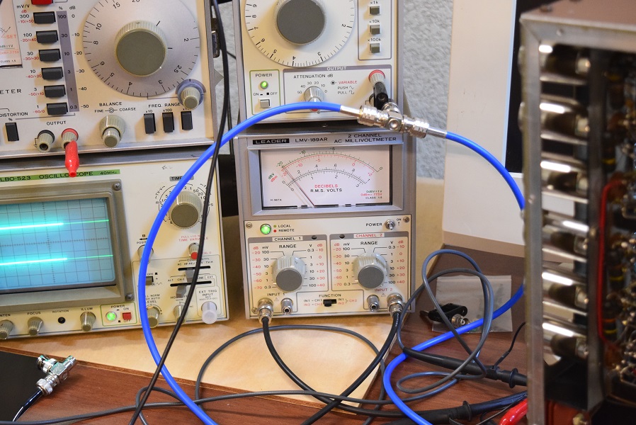 フォノイコ入力をアースに落とし、ラインアンプ後の最終出力端子の電圧をミリバルで測定しています。