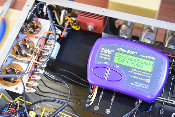 高圧B電源の2段目のブロックコンデンサーです。以前に交換されているようです。ESRは少し高いようですがきちんと値が出て3ブロックとも正常です。