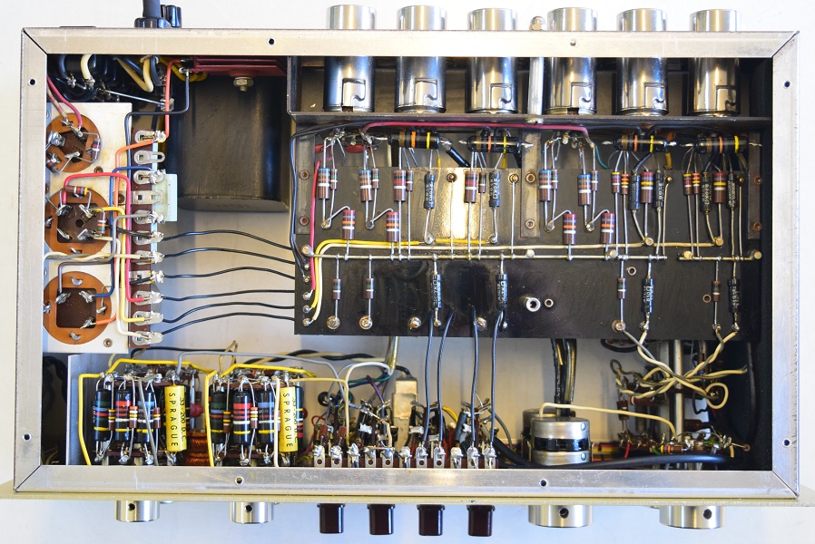 左より、高圧B電源初段φ25、低圧ヒータ用φ35、高圧セレン、イコライザー初段カップリング0.1uF/400V2本、同イコライザー最終段カソードフォロア後カップリング0.47uF/200V2本。