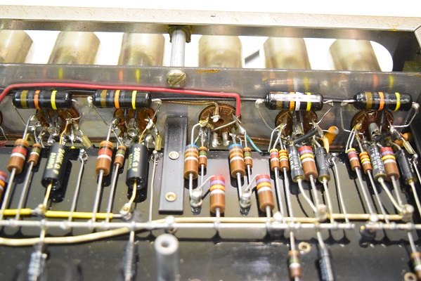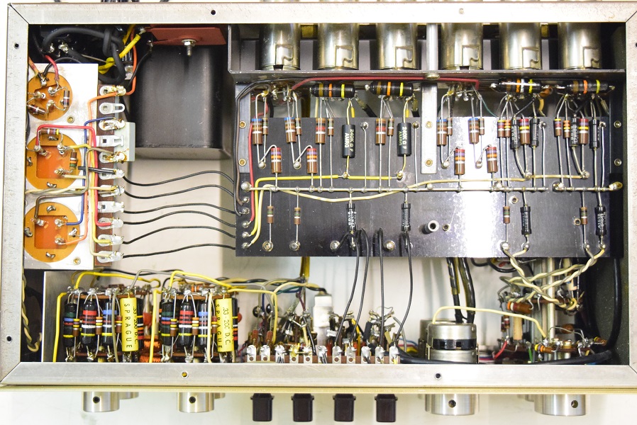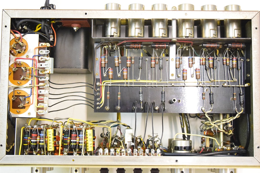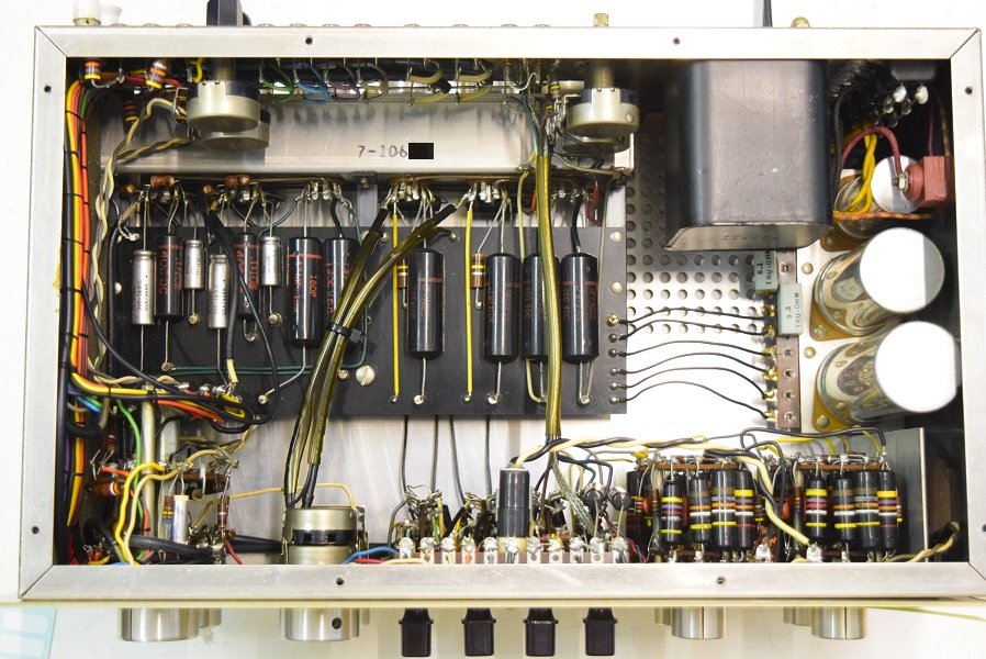 内部です。オールバンブルビーフルレストアになります。 こちらではいつもの見慣れた光景ですが、普通はこれが全て良品はあり得ない事です。 特に音に一番重要なラインアンプの0.22uF/400 (右から3,4本目)は既にどこも持っていない筈です。