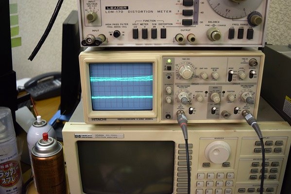 こちらは裏面の初段管後の0.01uFカップリングの後です。右のオシロの波形の様に殆どノイズはありません。