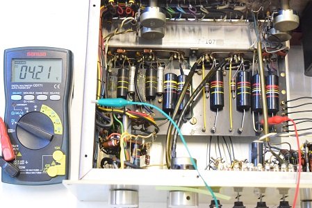 こちらはフォノイコ初段後の0.1uFです。何と44.7Vの漏れがあります。