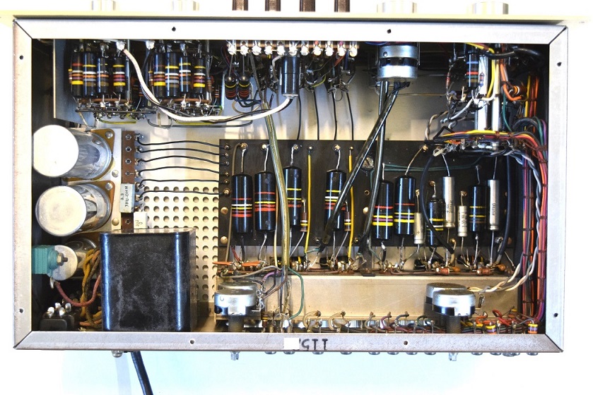 上から見た内部で、基板上にバンブルビーコンデンサーの良品が並んでいます。大変状態の良いクラロスタット製ボリュームが見えます。ポッチが付いていますね。
