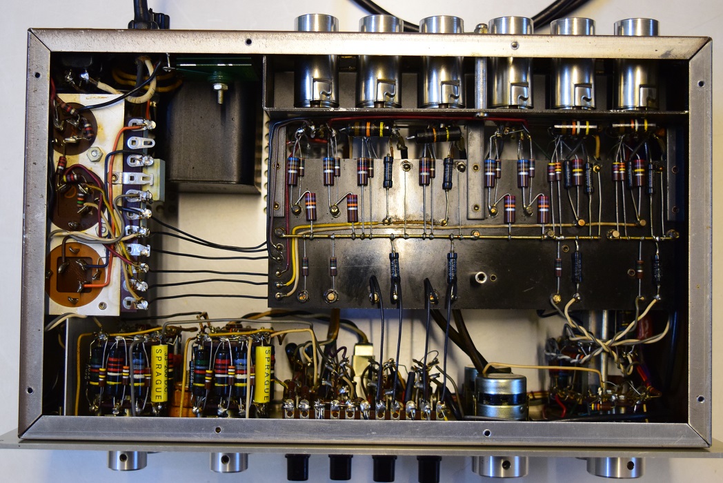 上から見た内部で、基板上にバンブルビーコンデンサーの良品が並んでいます。状態の良いクラロスタット製ボリュームと右端に良品の赤いセレン整流器があります。音の臨場感と透明感に大きく貢献しています。