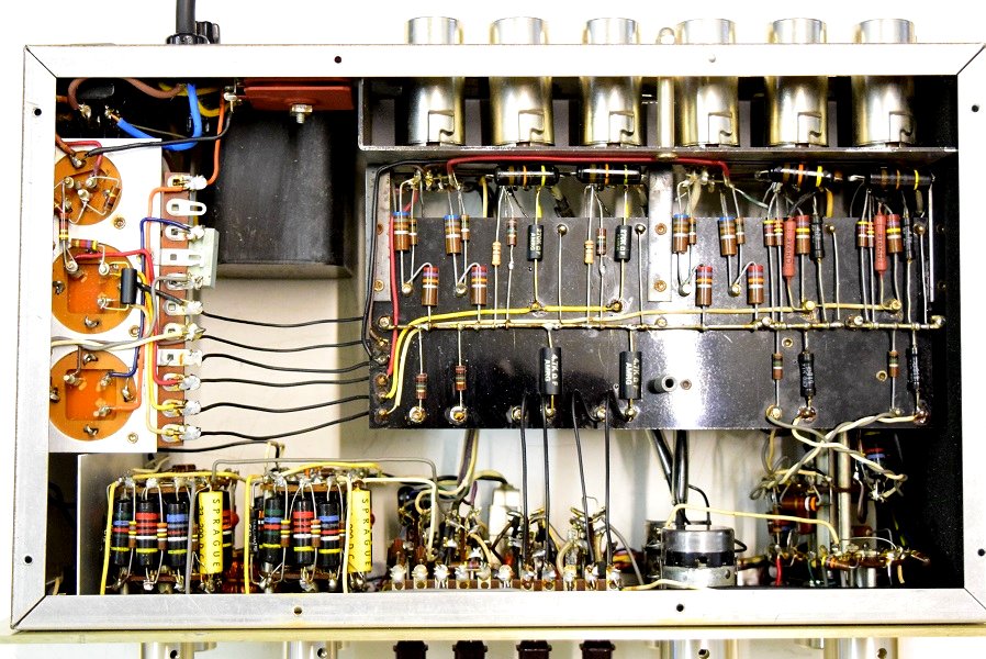 内部上面です。カップリングコンデンサーは全て当工房で良品バンブルビーに交換しました。フォノイコのカソードバイパスコンも全てMarantz7純正SPRAGUEの新品に交換しました。RIAA偏差も確認済です。ラインアンプのセラミックコンデンサーも純正SPRAGUEの新品に交換しました。電源回路も電解ブロックコンデンサー3本全てオリジナル仕様の新品に交換しました。高圧セレンも復刻の新品に交換しました。