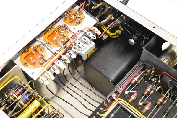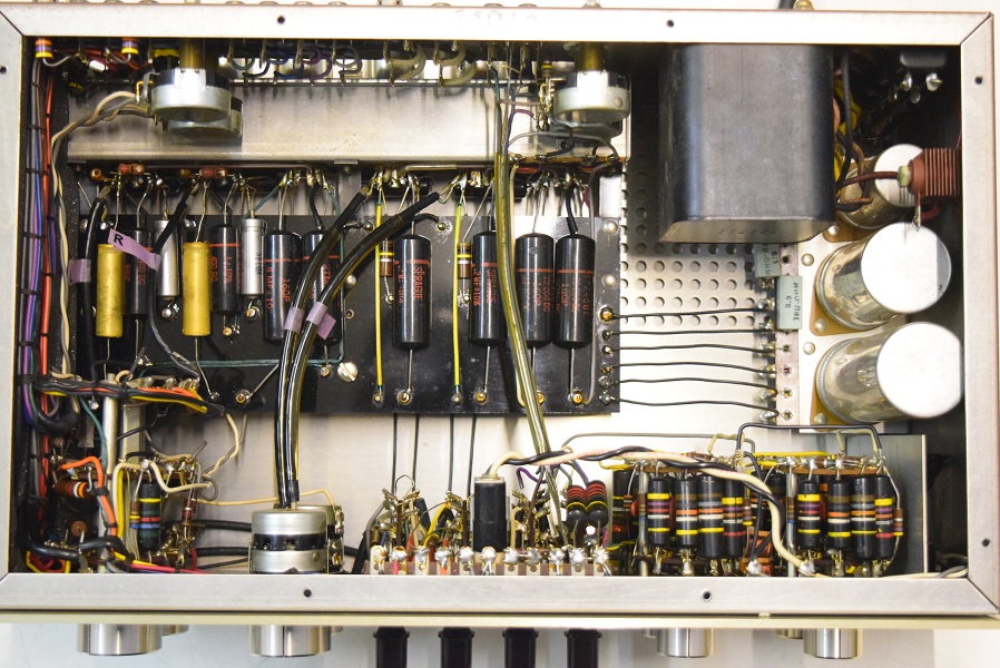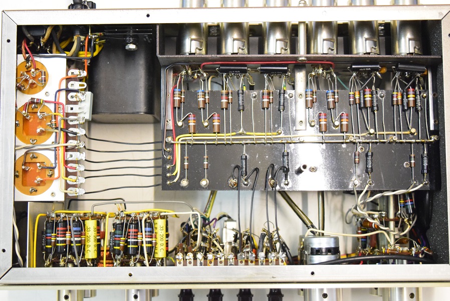 内部です。カップリングコンデンサーを全てブラックビューティーに交換されています。高圧セレンも交換されていますが電解ブロックコンデンサーとカソードバイパスコンはオリジナルのままです。