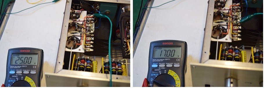 ヒーター用セレン後です。正規の電圧です。 ↑ヒータ電圧もかなり落ちています。正規電圧は19.8Vです。