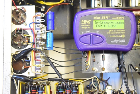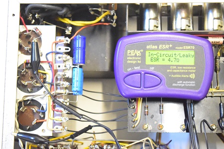 こちらは低圧の電解ブロックコンデンサーで未交換のオリジナルです。一部で計測不能の表示があり完全に不良です。