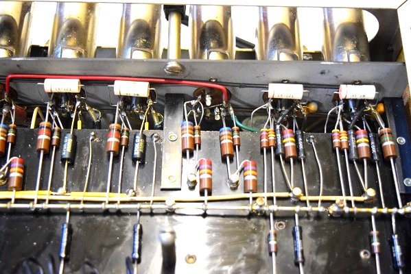交換した赤い高圧セレンとセレンの下にφ25のブロックコンデンサーが見えます。このφ25は極めて貴重な物で他ではもう手に入らないものです。また手前の長いφ35低圧のブロックコンデンサーも全く手に入りません。この為、他のレストア屋はどれも他の代品で改造します。本機も改造されていました。