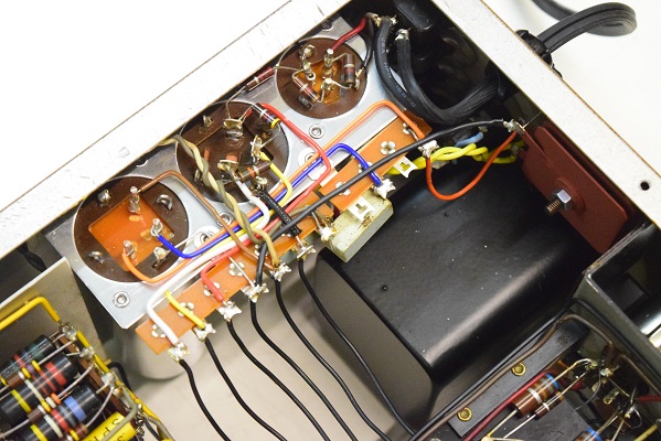 裏面です。低圧セレンと、今回はブロックコンデンサーのベースがボンドで付けられていてコンデンサーのみの交換ができなかったのでベースと一緒にアッセンブリーで交換しました。破損していたプレート抵抗を左右とも音の良いAMRGの容量の大きいタイプに交換しました。