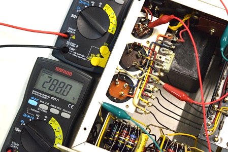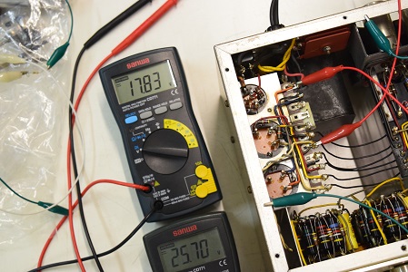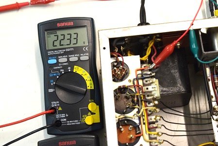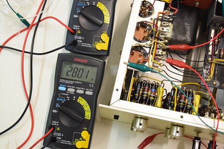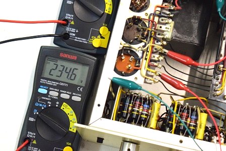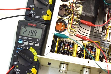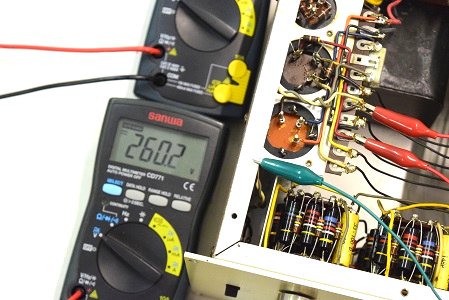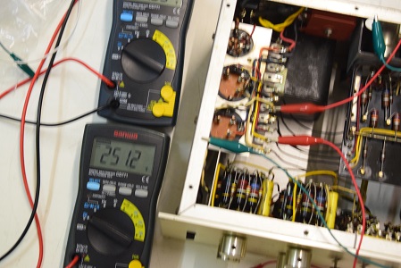左テスターは高圧B1です。265.4Vとかなり下がっています。右テスターはヒーター電圧です。15.21Vと真空管の動作限界値に近い状態です。