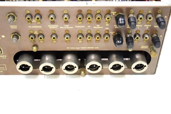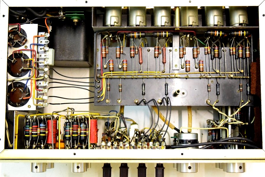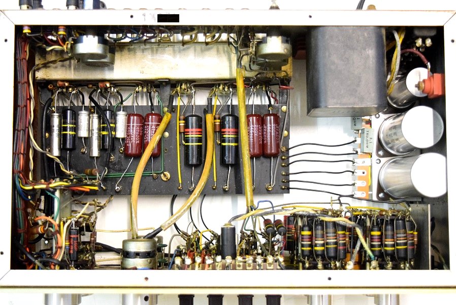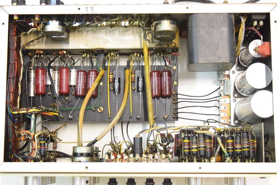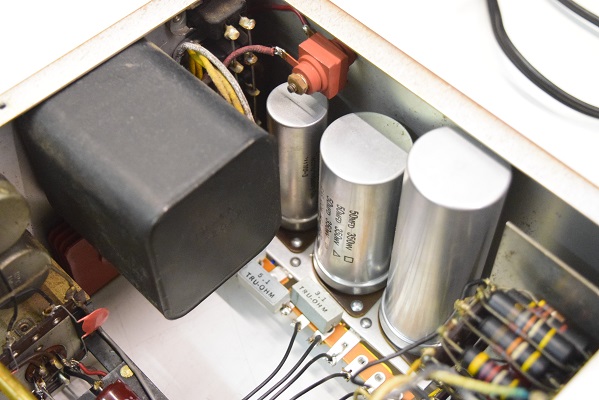 電源回路は電解ブロックコンデンサーを3本ともオリジナル仕様の新品に交換しました。高圧セレンも交換しました。バンブルビーは全て不良のため代品に交換しました。代品のコンデンサーはマランツ純正GoodALL-TRWの新品と音の良いフランス製です。フォノイコのカソードバイパスコンもマランツ純正SPRAGUEの新品に4本とも交換しました。ラインのセラミックコンデンサーもマランツ7純正SPRAGUEのNOS品に交換しました。