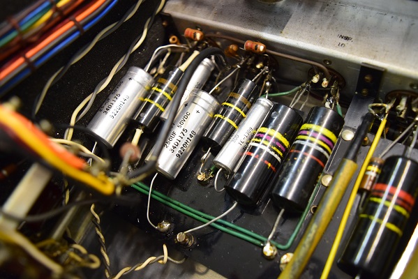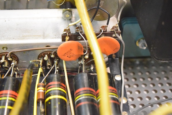 電源は電解ブロックコンデンサーを3本ともオリジナル仕様の新品に交換しました。高圧セレンも交換しました。左側に赤い純正SPRAGUEのセラミックコンデンサーが見えます。今回のレストアで交換しました。