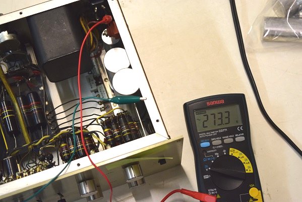 高圧全体が少し低いので電源トランスの出力電圧を計りました。AC273.3Vでやはり少し低い値です。しかし漏れは無いのでこのトランス固有の値と考えます。