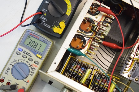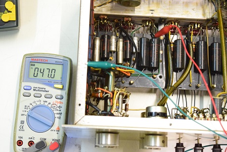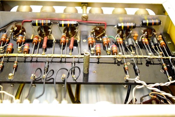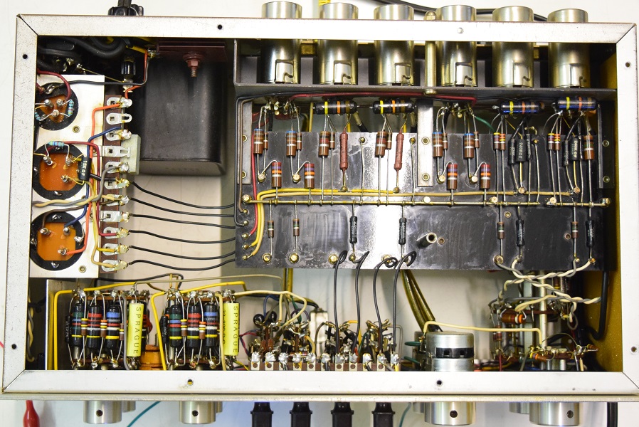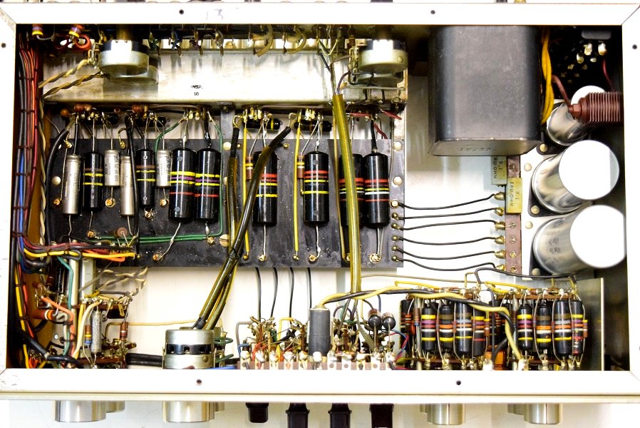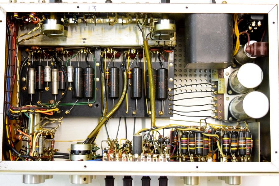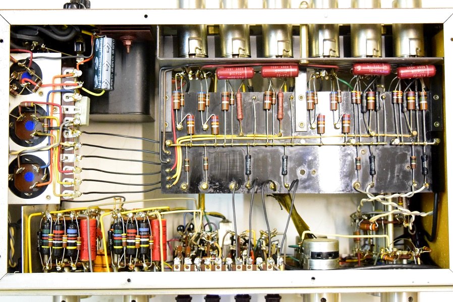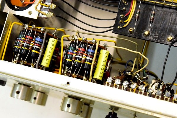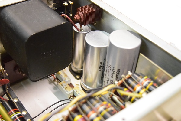 内部は、カップリングコンデンサーが全てブラックビューティーに交換してレストアされています。電源回路はセレンだけ交換されて電解ブロックコンデンサーはオリジナルのままです。