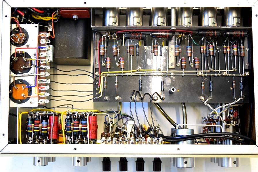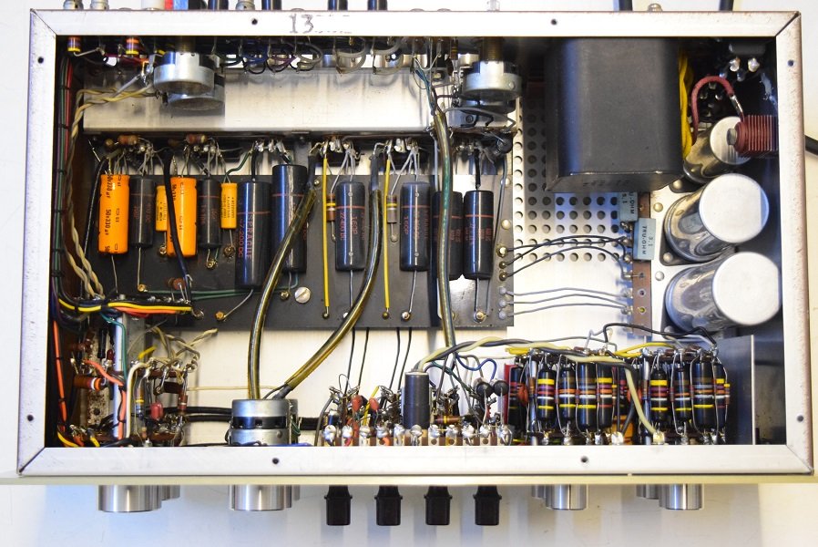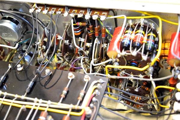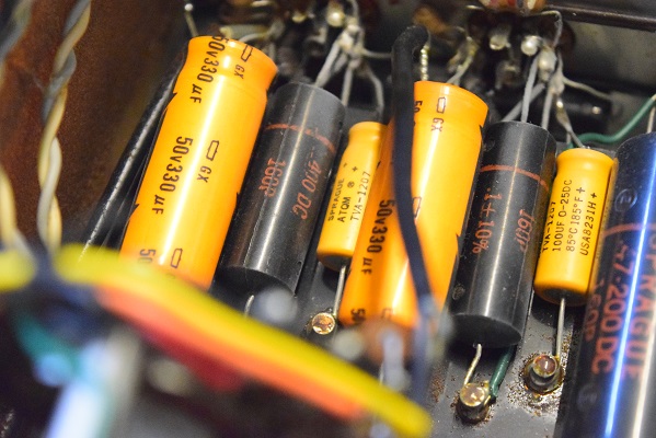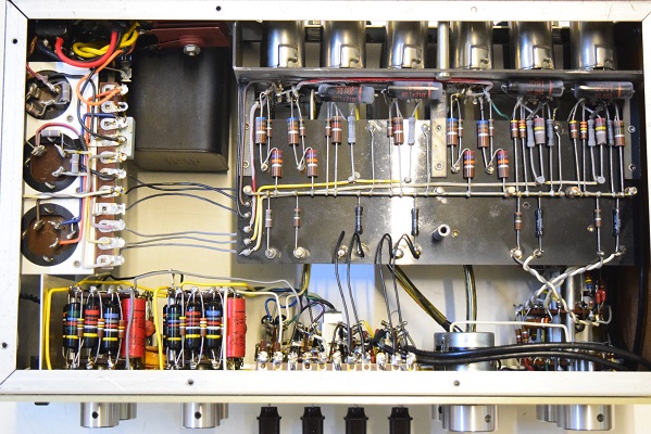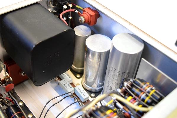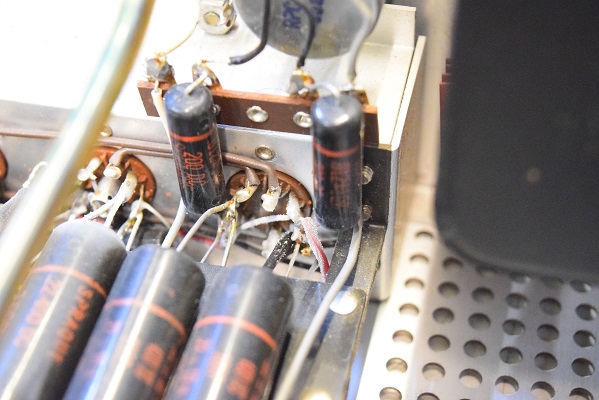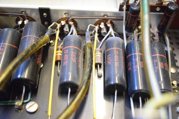 内部上面です。以前どこかでレストアされて、カップリングコンデンサーは全て160Pに交換されています。
