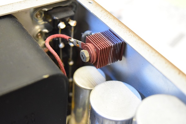 この黄色のコンデンサーはカソードバイパスコンです。これも前のレストア屋さんは手元にたまたま有った余り物を付けられたようです。