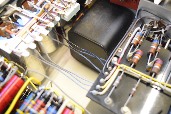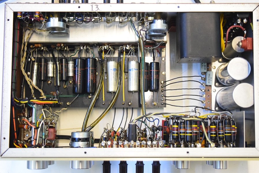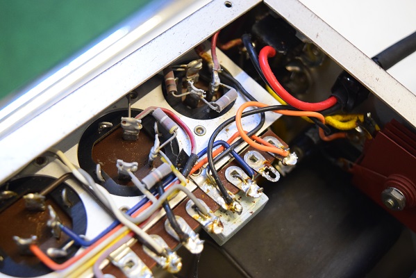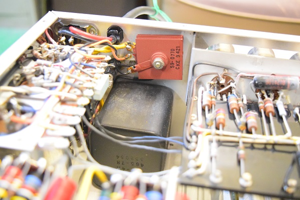 内部上面です。カップリングコンデンサーで音に重要な箇所にアリゾナキャパシタを使いました。これで曇った音が解消されMarantz7らしい煌びやかな音が戻っています。ただこのコンデンサー本来の音にはかなりのエージングが必要です。