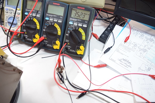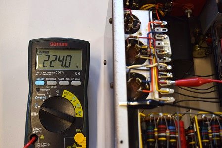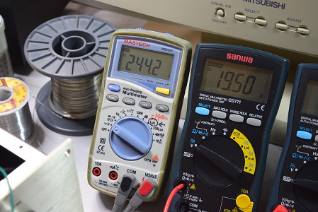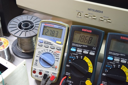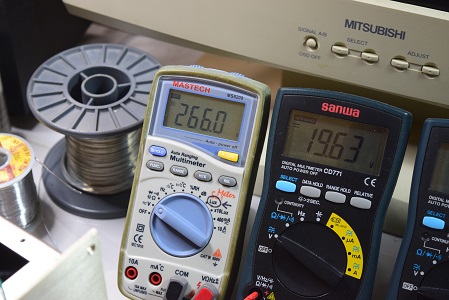 左の白いテスターは高圧B1です。 278.3Vで極めて良い値です。右の黒いテスターはヒーター電圧です。こちらも18.68Vで良い値です。