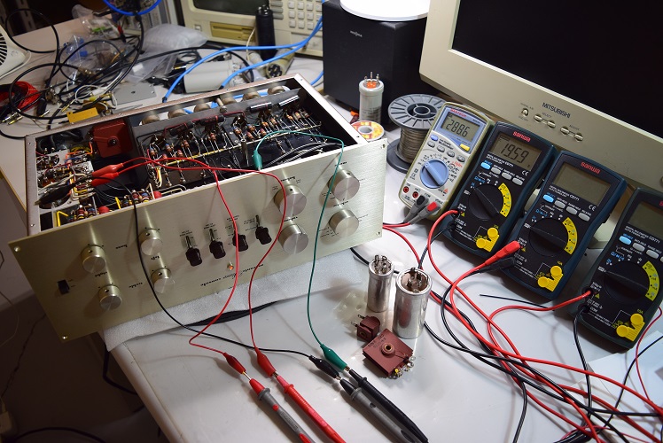 以前のレストアでカップリングコンデンサーを全てブラックビューティー(160P)に換えられていましたが、今回音に特に影響のあるところのみ音の良いコンデンサーに交換しました。フォノイコはRIAA偏差を決めるコンデンサーが劣化して値が変わっていたのでブラックビューティーからマイカコンデンサーに交換しました。