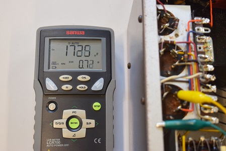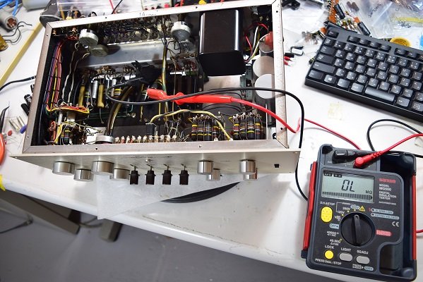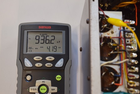 この他、表基板上のフォノイコのカソードバイパスコンは、電解液の漏れにより表面に塩が吹いているので検査するまでもなく4本とも新品交換が必要です。