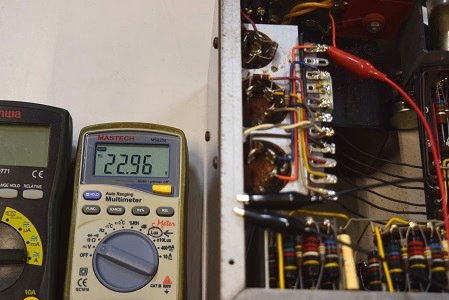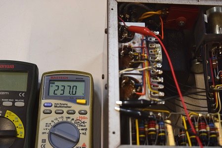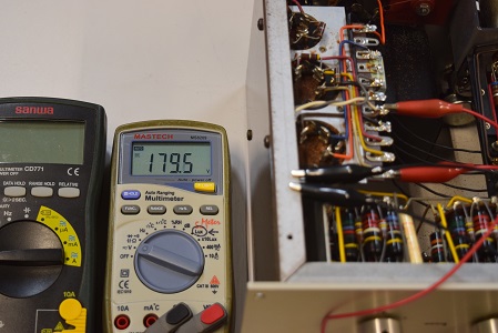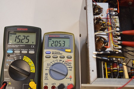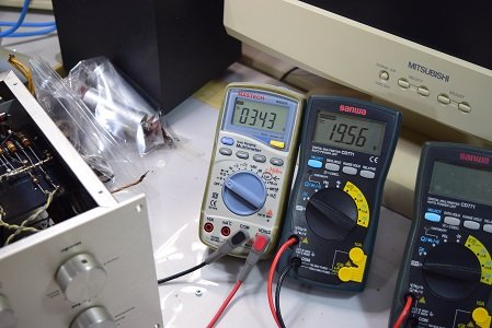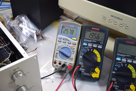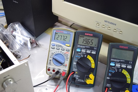 左の白いテスターは高圧B1です。277.2Vで良い値です。中央のテスターはヒーター電圧です。19.65Vで極めて良い値です。