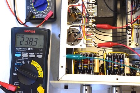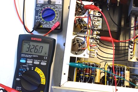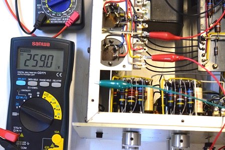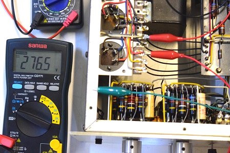 高圧セレン直後の電圧です。326Vを示し一見良さそうですがダイオードが併設されています。この為負の電荷も通過しているのでリプルが乗り、次のφ25の電解ブロックコンデンサーにダメージを与えています。