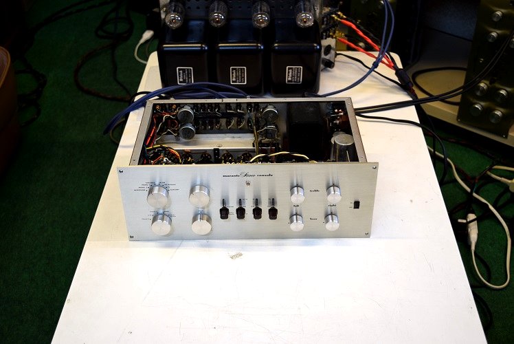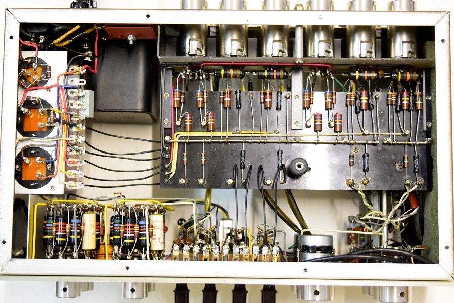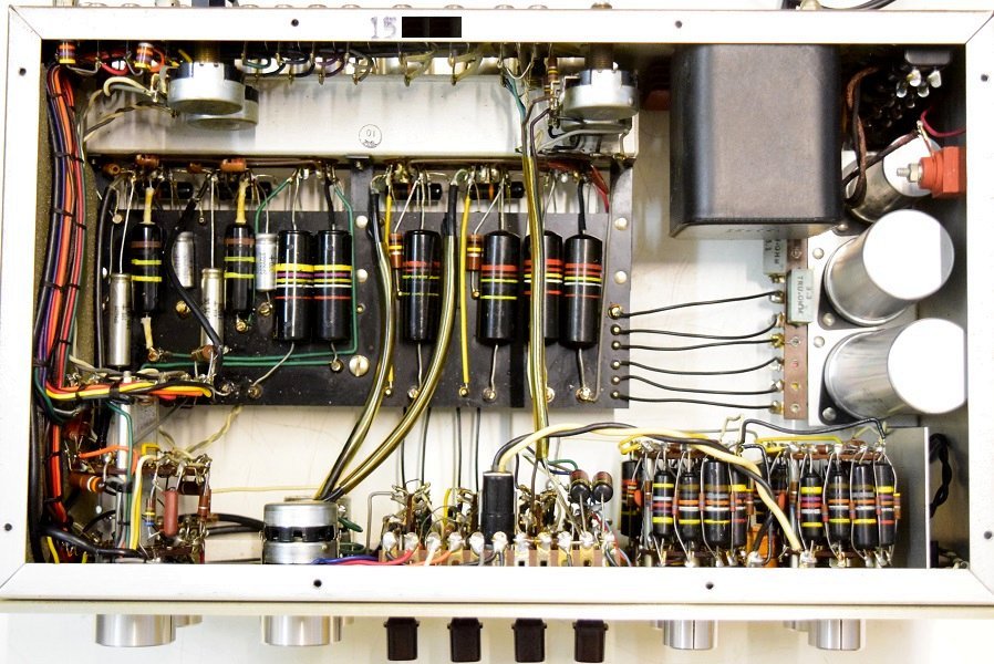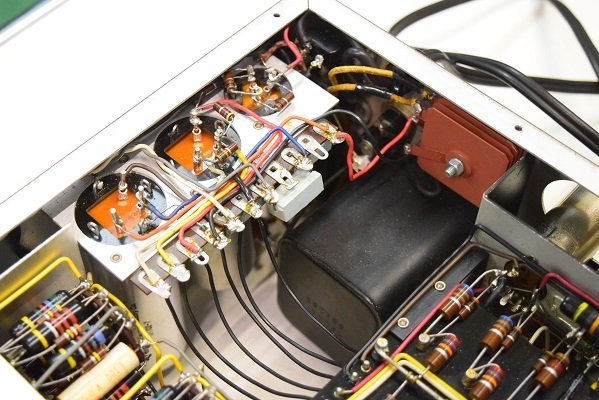 内部です。カップリングコンデンサーが一部ブラックビューティーに交換されています。フォノイコのカソードバイパスコンが国産の電解コンデンサーに交換されています。RIAA偏差コンデンサーがオレンジドロップに交換されています。高圧セレンにダイオードが併設されています。