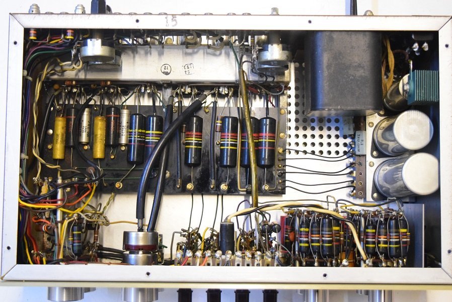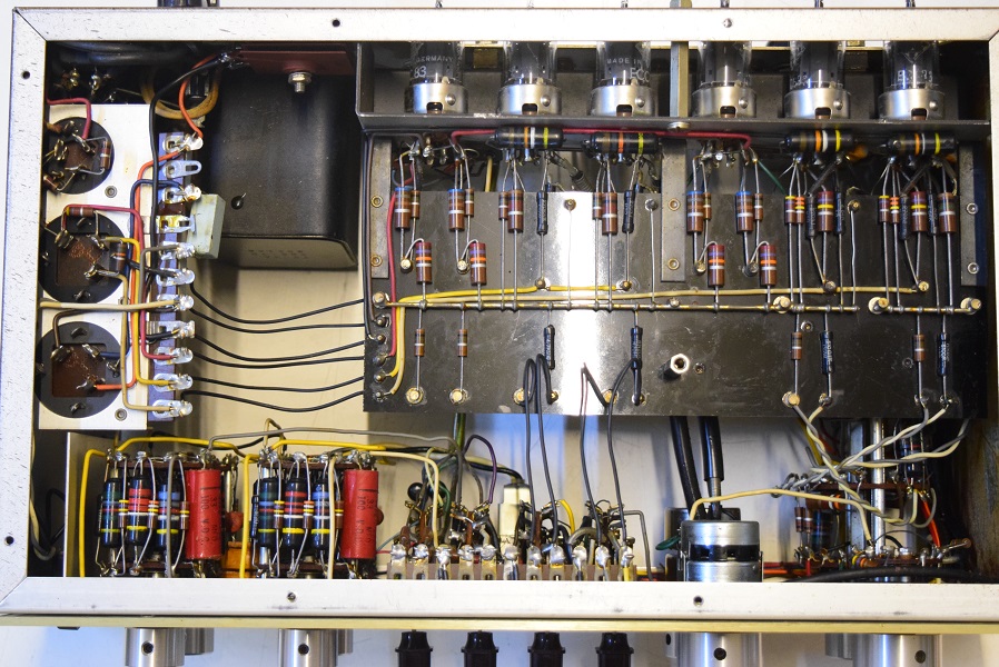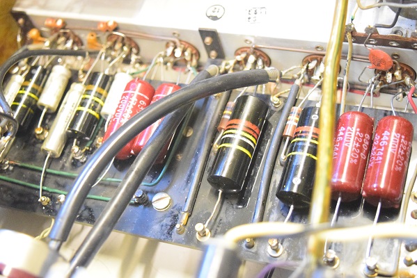内部です。カップリングコンデンサーはフォノイコ以外はオリジナルです。セレンの周りはご自身で交換された時に拭き取られたのか、きれいです。