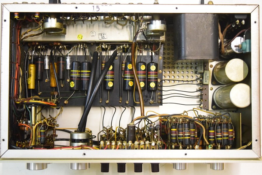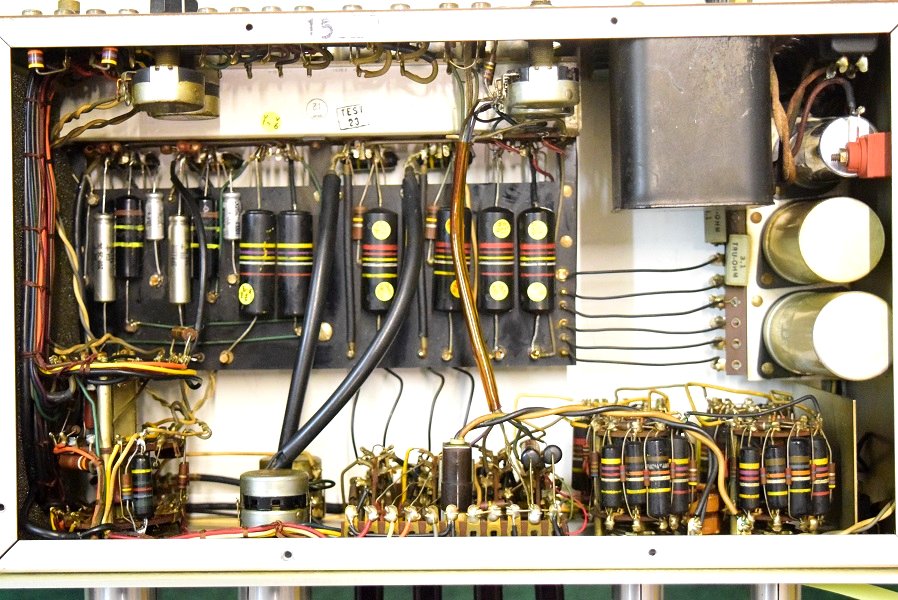 フォノイコ先頭以外のカップリングはバンブルビーです。電源のφ25電解ブロックコンデンサーは純正SPRAGUEに交換されています。高圧セレンも交換されています。フォノイコのカソードバイパスコンの2段目も交換されています。